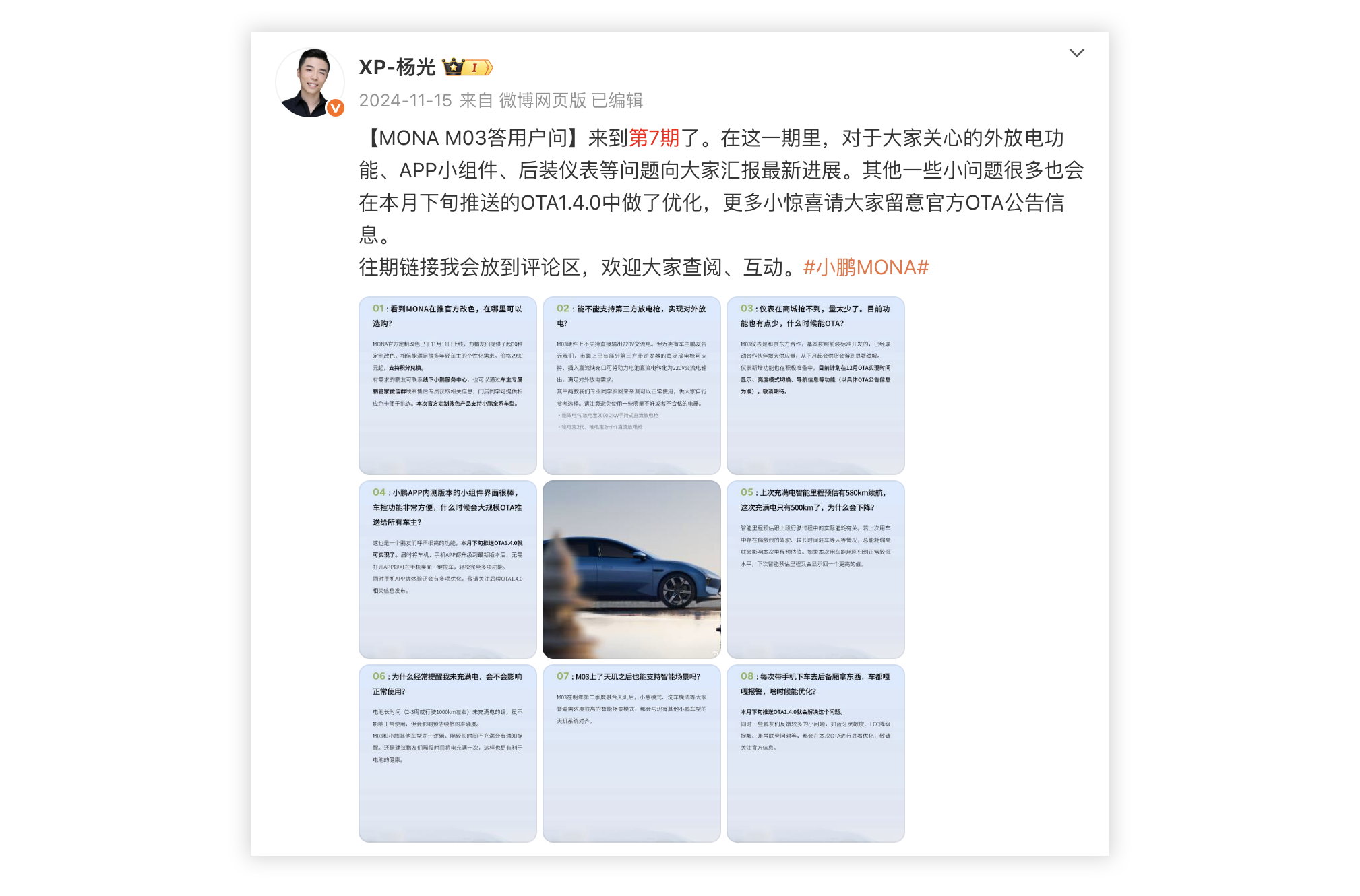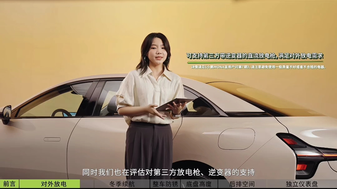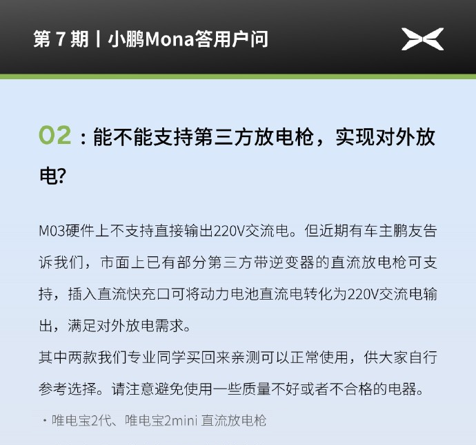小鹏汽车同样料到了大家的担忧,早在去年11月,小鹏官方就针对第三方直流口放电枪做了调查,并在官方App、各平台社交媒体推文公布了解决方案建议,原文如下:“M03硬件上不支持直接输出220V交流电。但近期有车主鹏友告诉我们,市面上已有部分第三方带逆变器的直流放电枪可支持,插入直流快充口可将动力电池直流电转化为220V交流电输出,满足对外放电需求。其中两款我们专业同学买回来亲测可以正常使用,供大家自行参考选择。”